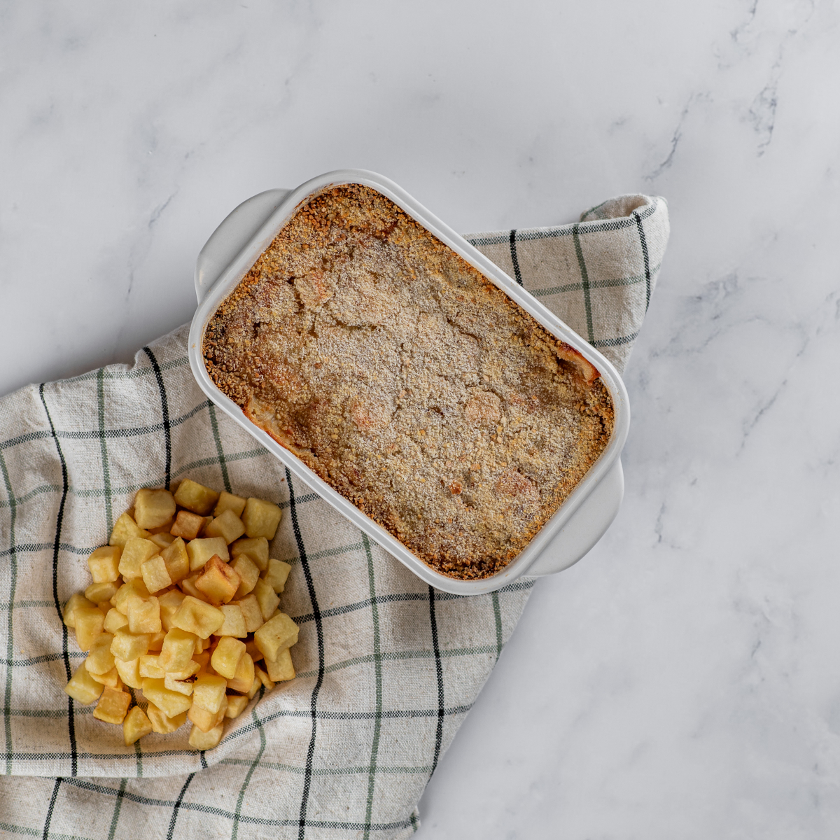 Bacalhau com batatinhas aos cubos enriquecido com molho de natas e mostarda.