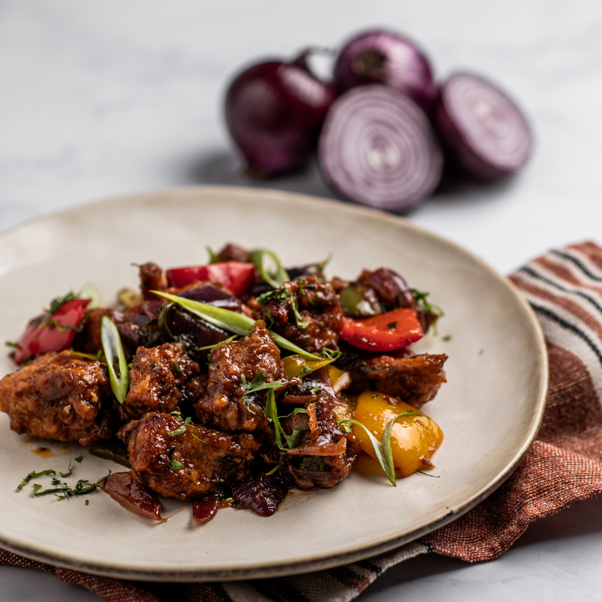 Peito de Frango, Cebola Roxa, Ketchup, Molho Soja, Pimento Amarelo, Pimento Laranja, Pimento Verde, Pimento Vermelho, Açúcar, Amido de Milho, Alho, Gengibre, Óleo, Sal, Timur
