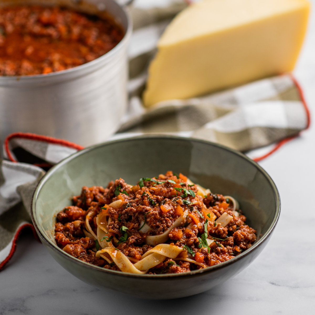 Massa tagliatelle envolta no nosso saboroso molho de bolonhesa.